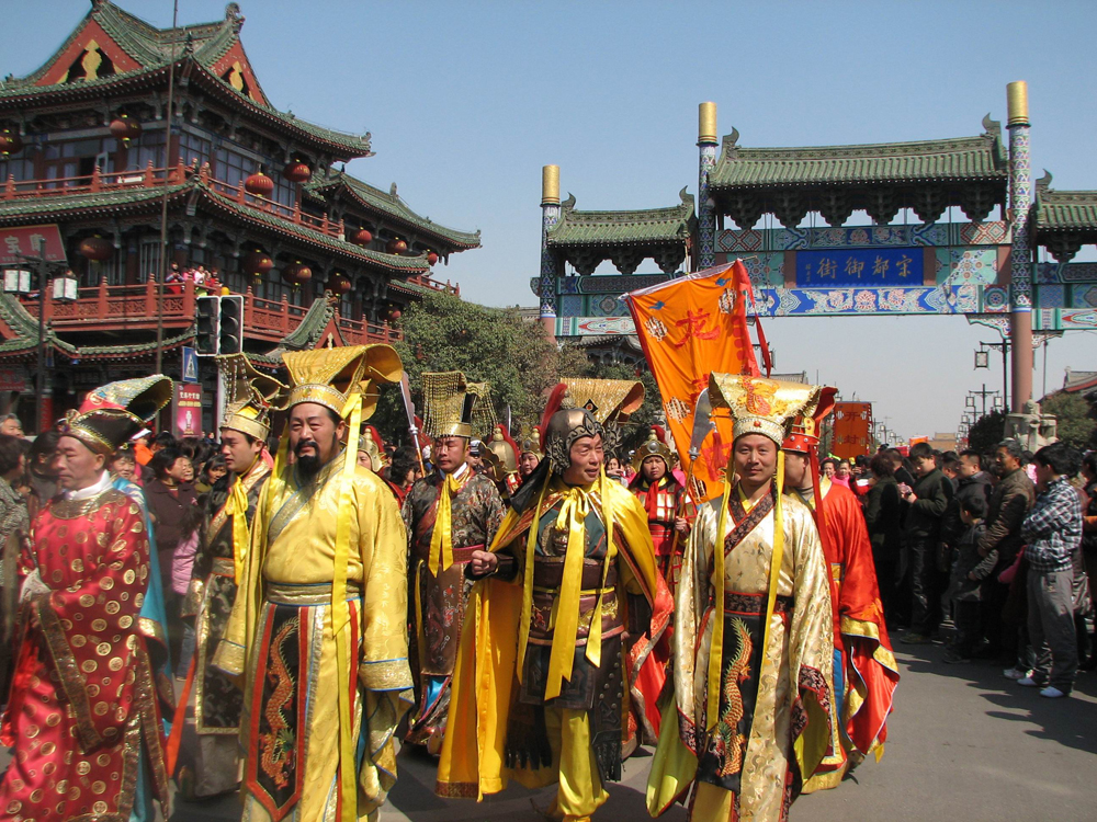 當天,開封街頭萬人空巷,巡遊隊伍從開封午朝門廣場出發,沿中山路,經朱雀苑,抵達開封府門前廣場,九位大宋皇帝身披龍袍,舉手投足威嚴不容侵犯;身着宋服的仕女衣襟飄飄,鳳冠霞帔;天波府楊家將手握長槍,英武不凡,他們不時變換招式與動作的槍陣,再現了《東京夢華錄》中禁軍出巡的威武場面。