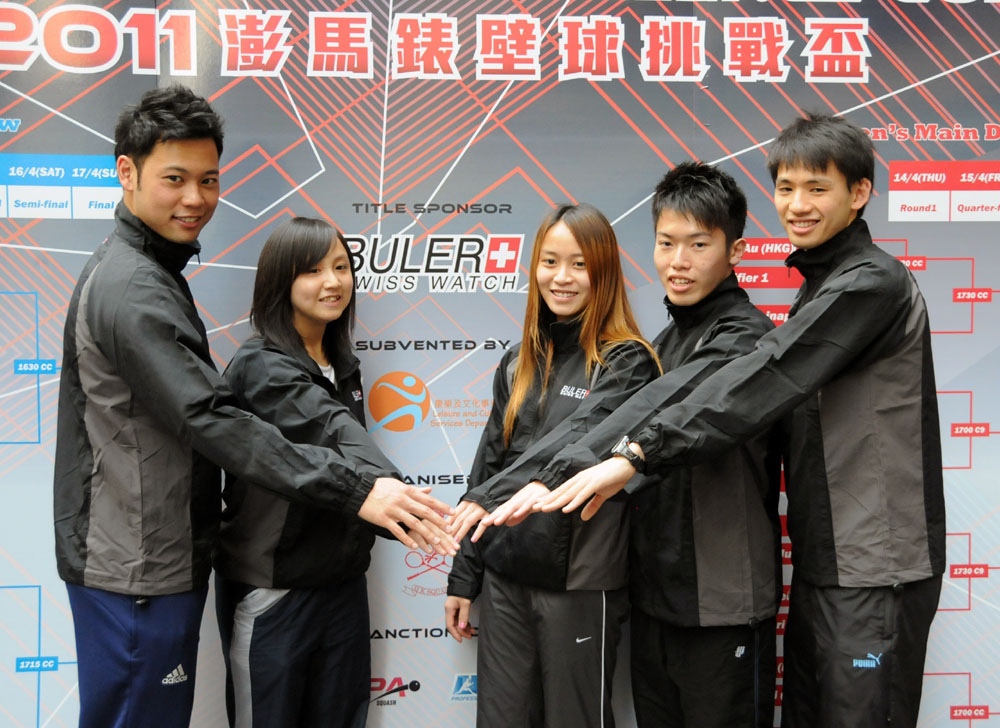 圖:左起:港隊的劉少維、廖梓苓、李嘉雯、歐鎮銘及李浩賢,將出戰下周展開的壁球挑戰杯\本報攝