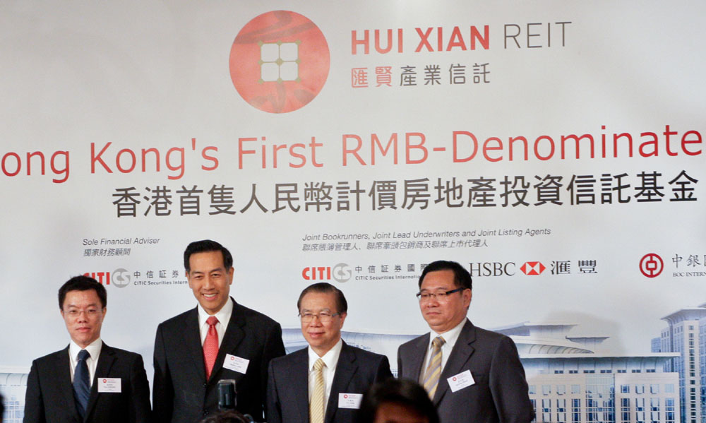 圖:匯賢房託第五天公開招股,券商累計為其借出6.57億元人民幣孖展額,相當於公開發售未足額認購。上圖右二為主席甘慶林