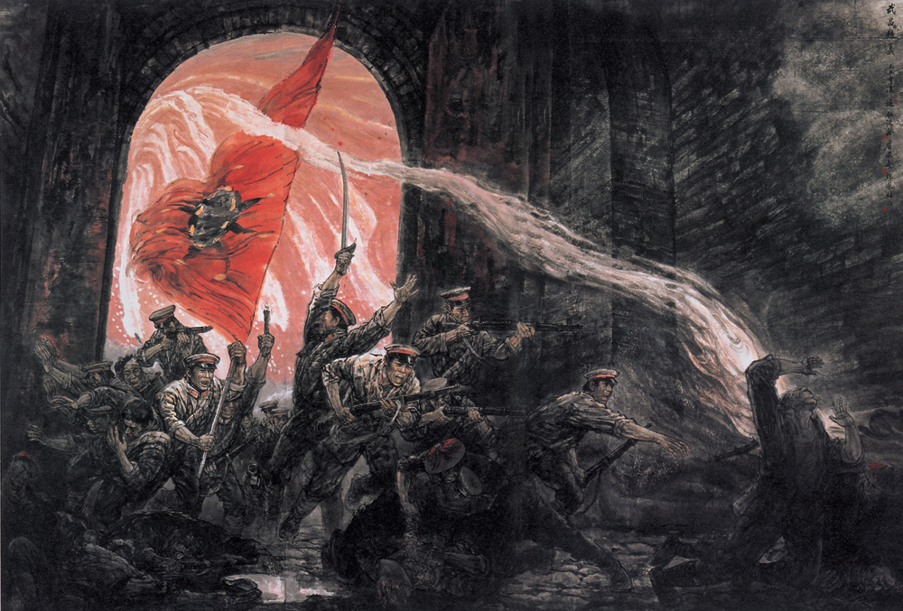 「一個雨夜,起義軍隊衝進城北門,奪取了清軍守衛的軍械所,佔領了核心的彈藥庫,引發了辛亥革命熊熊大火的燎原燃燒……」這是重大歷史題材美術創作中《武昌起義》所描繪的畫面。作品通過表現革命前夜的戰鬥場面,來反映武昌起義所打響的反對清王朝的「第一槍」。從整幅畫面來看,沖天的火光和鮮紅的革命義旗映照着整個搏鬥的場面,在一片黑暗勢力的包圍下,人民革命軍奮起反抗,欲推翻封建王朝。那面鮮紅的革命義旗彷彿是革命軍的鮮血染成,激勵着戰士們奮勇向前,又彷彿一盞明燈指引了革命前進的方向。火光,作者在這裡巧妙地將它安排在畫面的中心位置,籠罩在整個戰鬥場面的上空,預示革命者爭取光明和幸福的激情正在熊熊燃燒。整幅畫面構圖以火光和義旗為中心呈放射狀向外延伸,畫面的主體是一組衝進城門的義勇軍,其中前景是與清軍守軍搏鬥的人物形象,畫面左側的一組表現了國民軍焦灼的搏鬥場面,右側則是被流彈擊中倒下的清軍。