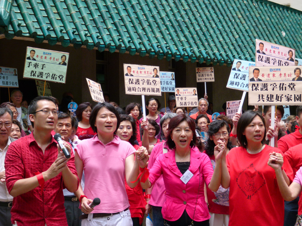 民建聯昨日組織過百家庭參加「『手牽手保護孚佑堂』──紅絲帶大行動」,要求政府將位於美孚有幾十年歷史的社區會堂──「孚佑堂」的土地性質,由現時的「住宅(甲類)」用地(即可興建高樓大廈)變更為「政府、機構或社區」用地,以杜絕被不適當使用的可能性。本報攝