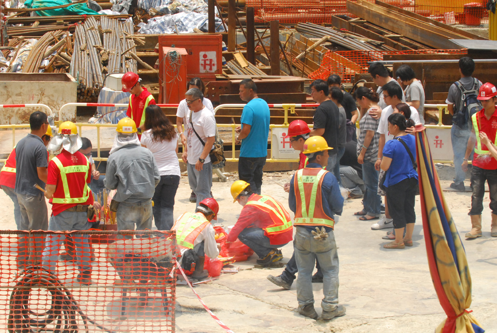 【本報訊】前日在荃灣國瑞路一個地盤發生的兩死工業意外中,兩名遭數以噸計重鋼筋壓死的工人的家屬昨晨返回意外地盤與承辦商就恩恤金及賠償問題進行商討,初步家屬對公司安排滿意。事後死者家屬與工友一行數十人到地盤意外現場了解事發經過及進行拜祭,期間兩名死者妻子數度難忍哀傷哭成淚人,令聞者心酸!