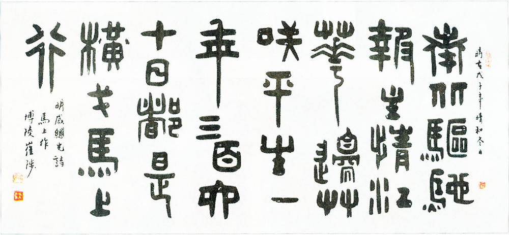 他的書法具有個人的風格,在他的篆書中既保留了質樸平實,並且在圓起圓收的線條中,結合隸書「波勢」的線條形成律動,表現出篆的莊重與威嚴,又加上了隸書的波勢起伏用筆而造成的動態。他的書法作品發揮出篆書的圓勁古雅,也體會出隸書的方勁古拙。