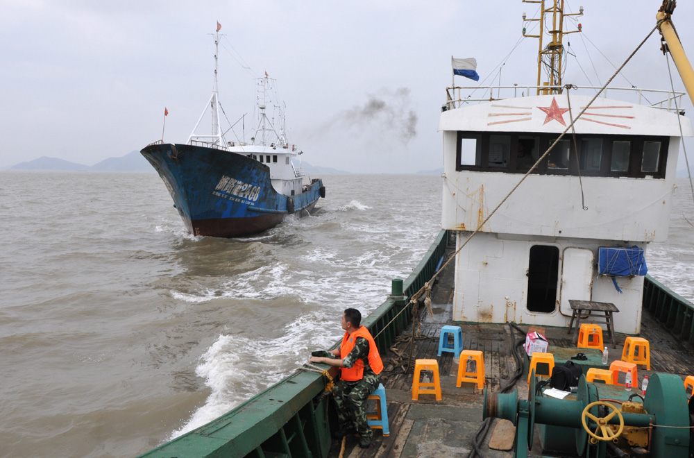 圖:一艘漁船13日凌晨在浙江台州路橋劍門港外海域沉沒,導致一人死亡,六人下落不明。圖為台州救援漁船在事發海域搜救 新華社