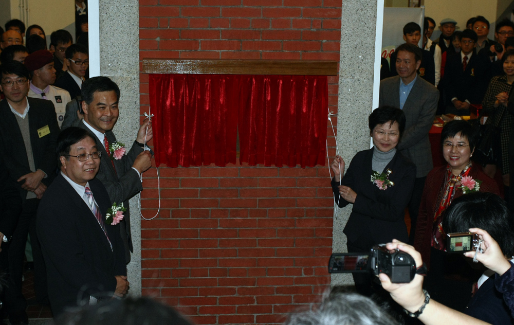 圖:梁振英(左二)和林鄭月娥(左三)等主持英皇書院列作法定古蹟揭幕禮/本報記者黃洋港攝