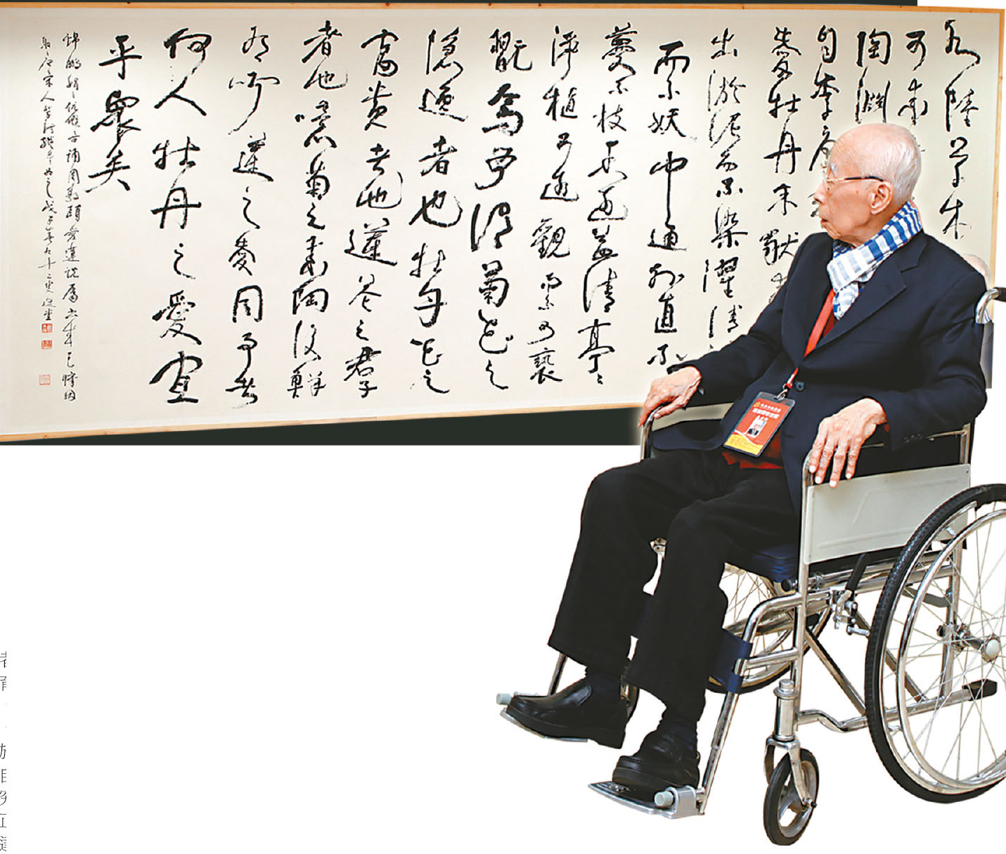 圖:饒宗頤教授正在觀賞其大型書法作品《愛蓮說》