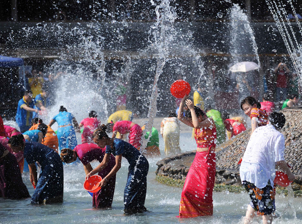 圖:傣族群眾在景洪市傣族園景區潑水狂歡(新華社)