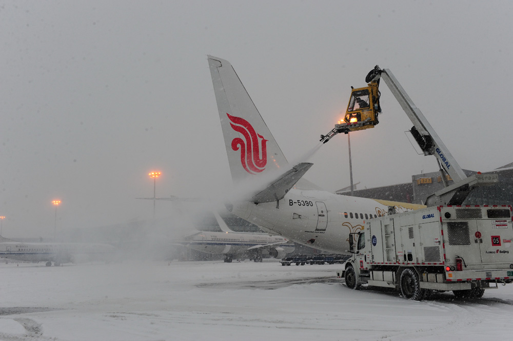 圖:北京首都機場出動除冰車對飛機進行除冰作業(新華社)