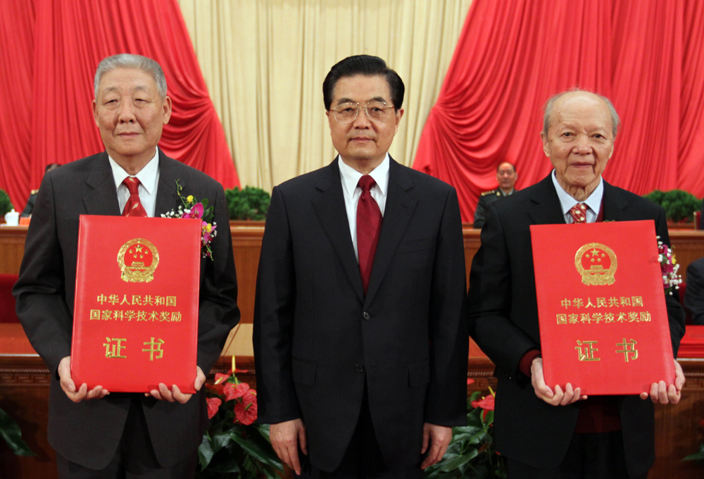 圖:中共中央總書記、國家主席、中央軍委主席胡錦濤向獲得2009年度國家最高科學技術獎的中國科學院院士谷超豪(右)、孫家棟(左)頒獎(新華社)
