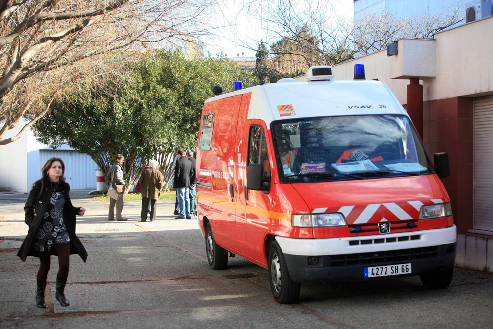 圖:一架救護車十三日在法國佩爾皮昂大學門外停泊,等待救援傷者(法新社)