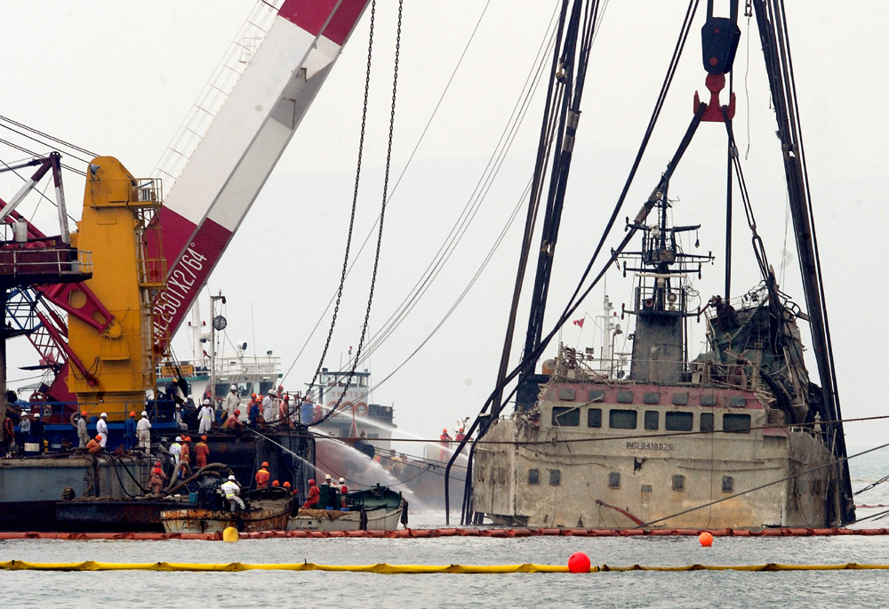 圖:烏克蘭補給船沉船案終於判刑,本港領港員首次被刑事檢控。圖為重型打撈船「華天龍」號在08年4月打撈有關補給船的情況(資料圖片)