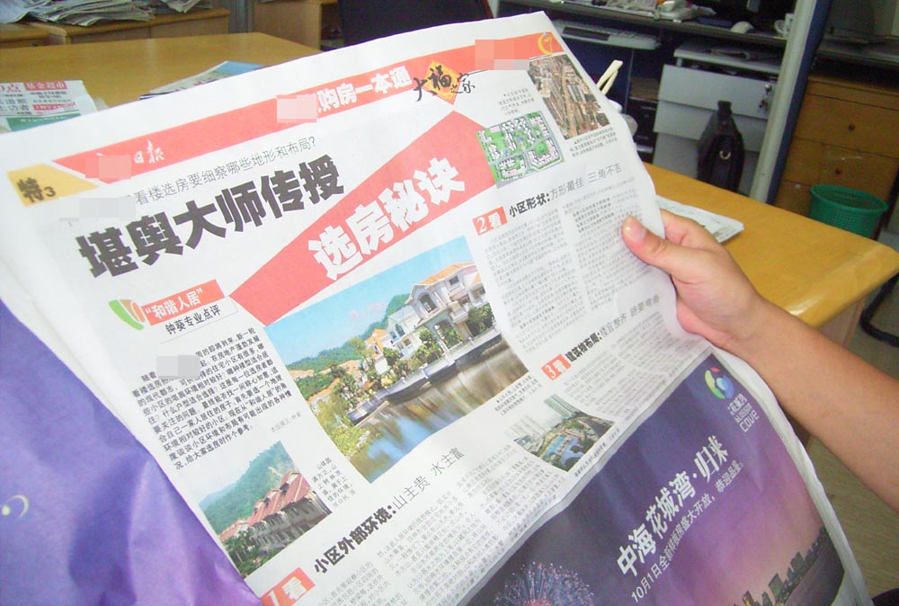 圖:近年,地產等風水顧問逐漸興旺,廣州連報紙都公開以「堪輿大師」作地產廣告 (本報攝)