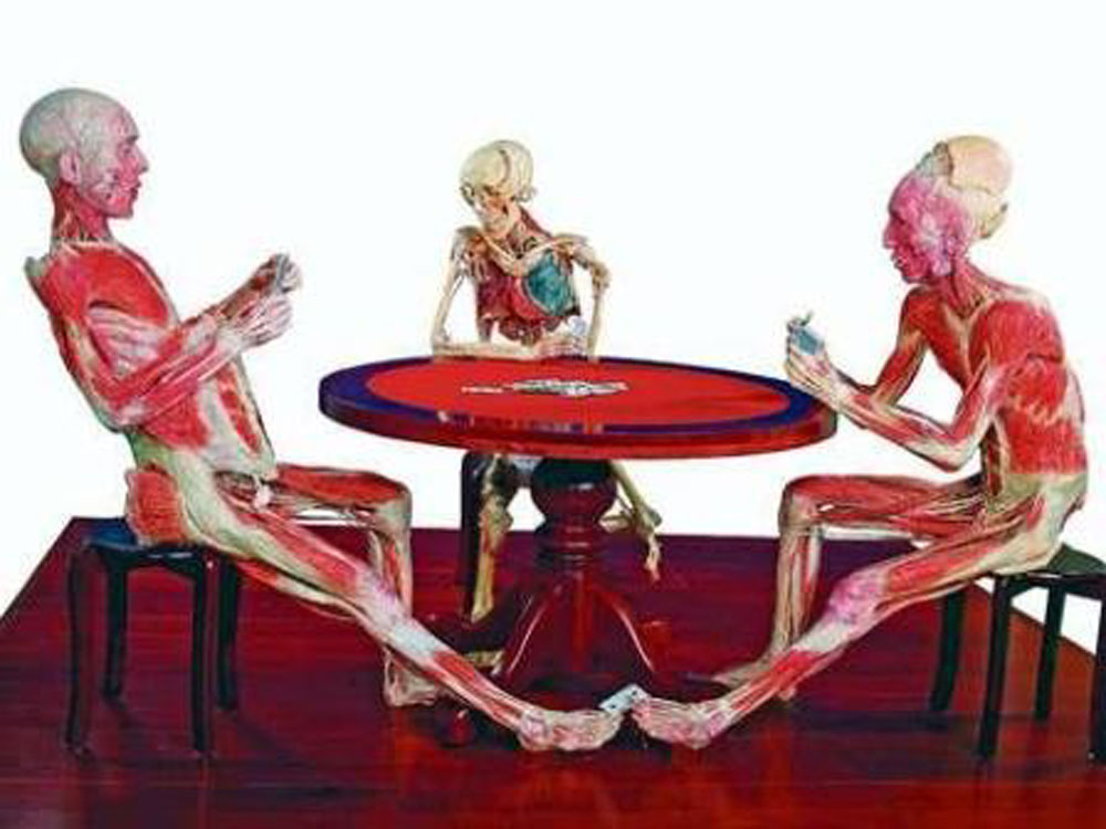鞏特爾博士解釋道:「右邊那具屍體拿着牌、弓着背,從對它頭骨的研究我們可以得知他當時的神經系統處於緊張思考狀態;左邊那具屍體拿着牌,身子微微向後仰,他的腹壁被開膛,和從臀骨的研究可見其當時也是處於一種思緒集中的狀態;中間那具屍體則明顯有竊看他人撲克牌的意圖,從對它胸腔和頭骨的研究表明,他顯得比較散漫、不專心。」鞏特爾博士還補充道,這些展覽不僅能讓觀眾看到生命的不同階段,或是展現人體的解剖結構和功能,有時候還能了解他的心裡在想什麼。(德國《圖片報》)
