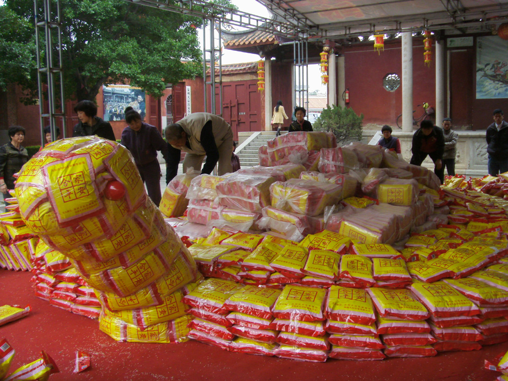在泉州天后宮大殿廣場上搭建的大帳篷裡,澎湖天后宮管委會主委楊國夫帶領幾位台灣「米龜」製作高手,在精心製作大「米龜」。一群泉州當地的媽祖信眾「義工」,自願充當下手,工程進展很快。據隨團到現場指導的澎湖縣文物學會幹事高啟進介紹,每年元宵期間,台灣居民大都舉行「乞龜壽」的喜慶活動。澎湖縣百分之七十的居民原籍在泉州,回故里做米龜,是一件大好事。眼見泉州的米龜一年比一年做大,今年大「米龜」,長八米,寬六米,高二米,雄壯威武,令人賞心悅目。