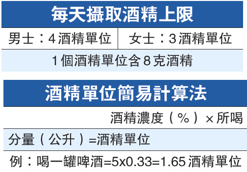 2.醫學界有一個每天酒精攝取上限的參考數字,你應該嚴格控制喝酒量在上限之內。(見圖)