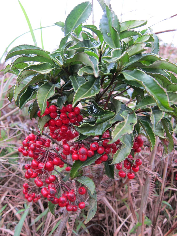 (Ardisia crenata)為紫金牛科常綠灌木,匍匐根狀根柔軟,肉質,表面稍帶紅色。葉互生,堅紙質,長橢圓形,急尖或漸尖,波狀鋸齒,兩面有突起腺點,花白色或粉紅色,頂生或腋生,傘形或聚傘花序。果球形,色紅,如黃豆大。根、葉,味苦、辛,性平,有活血祛風,解毒消腫的功效,對上呼吸道感染,咽喉腫痛,扁桃體炎,支氣管炎,風濕性關節炎,腰腿痛等均有治療作用。