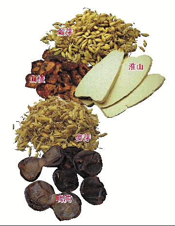 山楂肉,是薔薇科植物野山楂及山楂的成熟果實。性味酸、甘、微溫。入脾、胃、肝經、功能消食化積,散瘀行滯。常用於食積停滯,油膩肉積,腹痛泄瀉;及產後瘀阻腹痛,惡露不盡,並一切瘀滯出血;和疝氣偏墜脹痛等症。據《本草綱目》說:「化飲食,消肉積癥瘕,痰飲痞滿,吞酸,滯血痛脹。」《日用本草》說:「消食積補脾,治小腸疝氣,發小兒瘡疹。」臨床實驗證明山楂能擴張血管、降低血壓、降低膽固醇、收縮子宮,有增加胃液消化酶,幫助消化的作用。焦山楂的煎劑,對痢疾桿菌,及綠膿桿菌有強烈的抗菌作用。配合有消食和中、健脾開胃,而且有促進消化而不傷胃氣的穀芽和麥芽,以及擅補脾胃虛弱,食少倦怠,治脾虛泄瀉的淮山藥同煎湯,當能對食積不化,脾胃虛弱引致消化功能障礙的疾病,有迅速消除的功效。再加入消化功能特強的家禽(雞和鴨)的胃(俗稱「雞肫」、「鴨肫」。)更收健胃消食之功。考雞肫、鴨肫二物,皆有滋陰養胃,利水消腫功用。只不過雞肫性味甘溫,而鴨肫味甘鹹但性寒,一溫一寒之品質不同而已。兩物皆為家禽的砂囊(即胃囊)。囊裡有一層黃色或黃綠色的縱橫條紋的角質內膜,即是中藥的雞內金和鴨肫衣。兩物皆有消食積、止遺尿的功效。根據現代藥理分析二肫內衣含有胃激素,能促進胃腺分泌。配合以上功能消食健脾的藥,當能治療兒童傷食諸症。