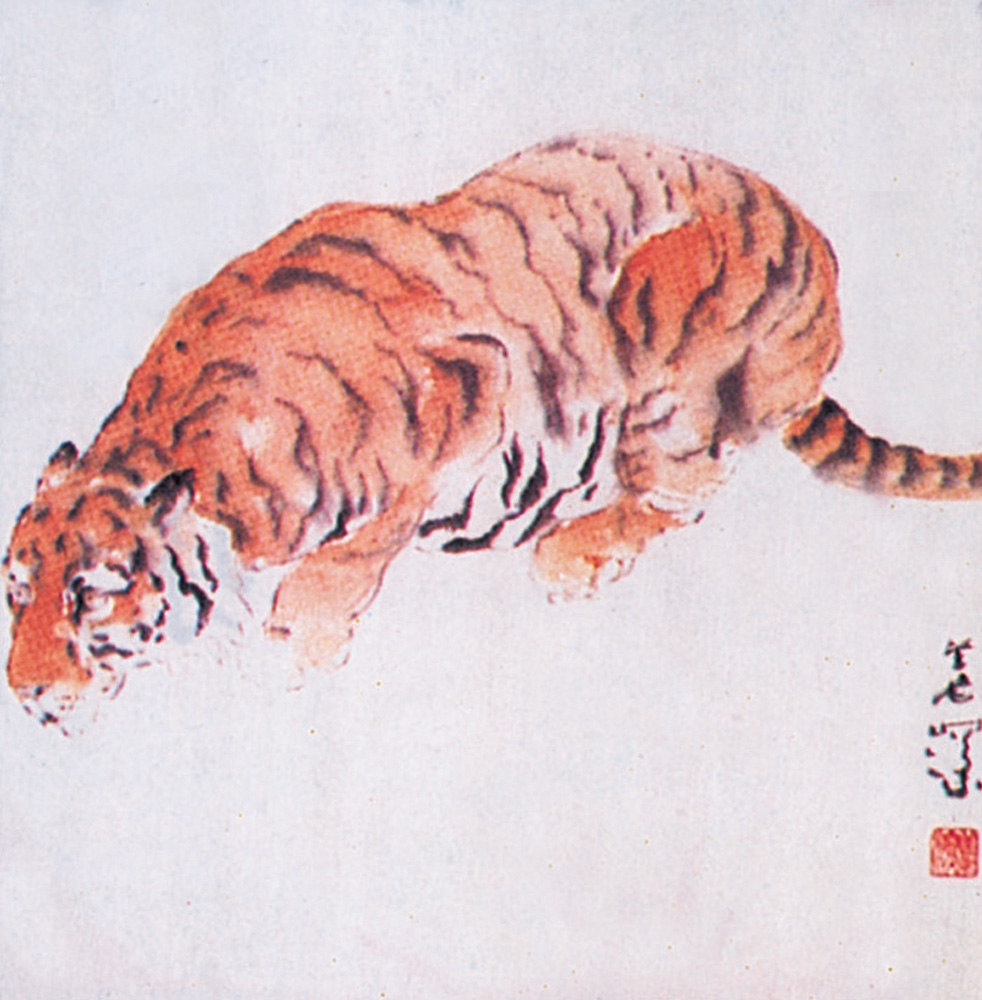 現代畫虎者,就像從前李龍眠畫羅漢與畫虎一樣,並非貼於門上(或直接繪在門上),而是作為一種觀賞的藝術。近代畫虎最著名者,莫過於楊善深(嶺南畫派「四君子」之一),名伶紅線女亦拜他為師。附圖就是他筆下所繪的一頭猛虎,兼容國畫與西洋畫的技法,融會一體。筆者參觀過他「萬象乾坤」的書畫展,其中一幅巨虎,構圖獨特,線條簡潔遒勁,使人印象猶新。