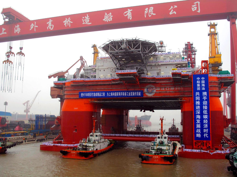 圖:【本報記者楊楠上海二十六日電】中國首次自主設計、建造,全球最先進第六代3000米深水半潛式鑽井平台「海洋石油981」,經過10個月船塢搭載總裝,今日在外高橋造船公司順利出塢,成為中國深水海工新的里程碑。據悉,該平台是中海油擁有,造價近60億元人民幣。