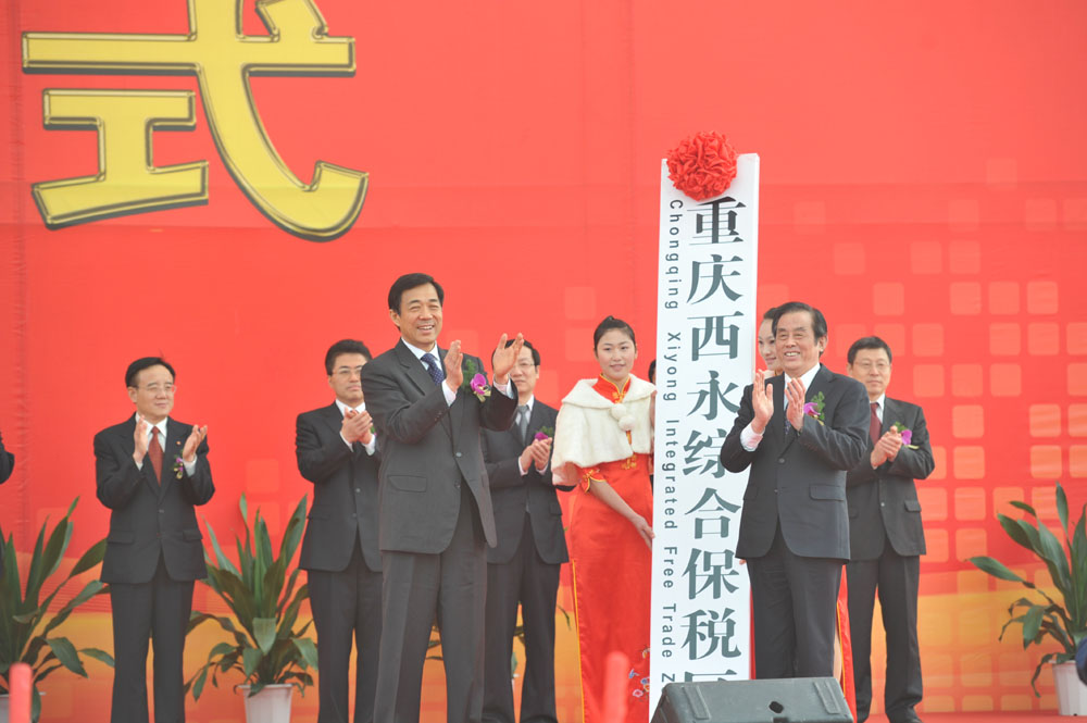 圖:重慶市委書記薄熙來(左)與海關總署署長盛光祖(右)共同為重慶西永綜合保稅區揭牌