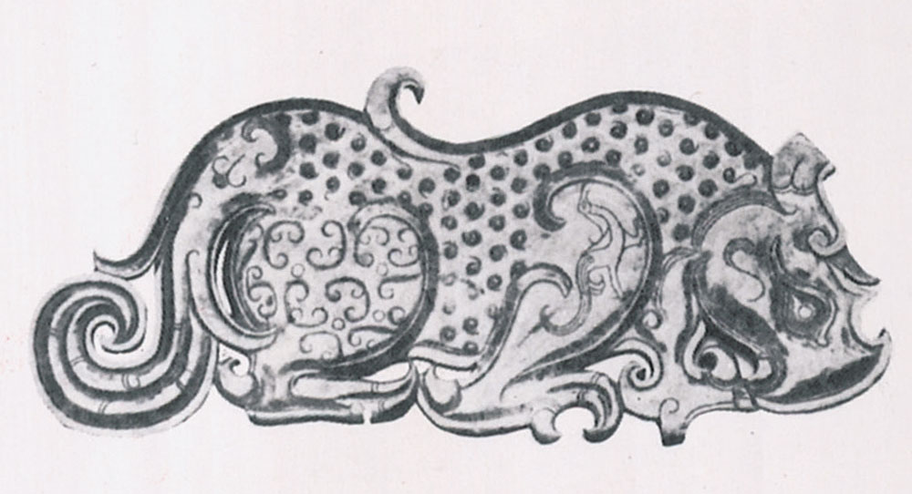 例如附圖的虎形佩飾(拓片),乃戰國較後期琢的典型玉虎(藏於佛里爾博物館)。其獨特之處不但虎身幾乎布滿穀紋,而且其前肢上半截是用陰線雕出一隻大步走的古代長尾鳥。以筆者所見我國古文物中,這種長尾鳥的造型酷肖戰國時楚國精製漆器上的鳥圖案。這類虎形玉佩,也有厭勝之意。殷商虎紋璜形佩的弧度不及戰國器大,但皆無拘滯之態。