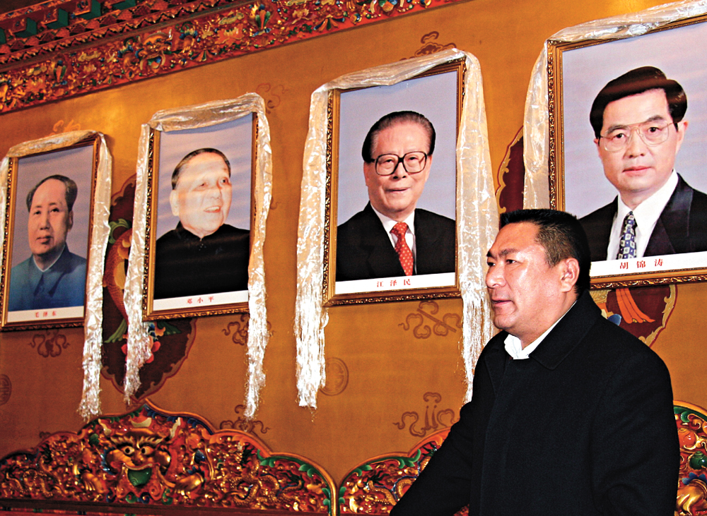 圖:西藏自治區工商聯副主席、達氏集團創始人達瓦頓珠的會客廳中,掛着毛澤東、鄧小平、江澤民、胡錦濤的畫像。(本報攝)