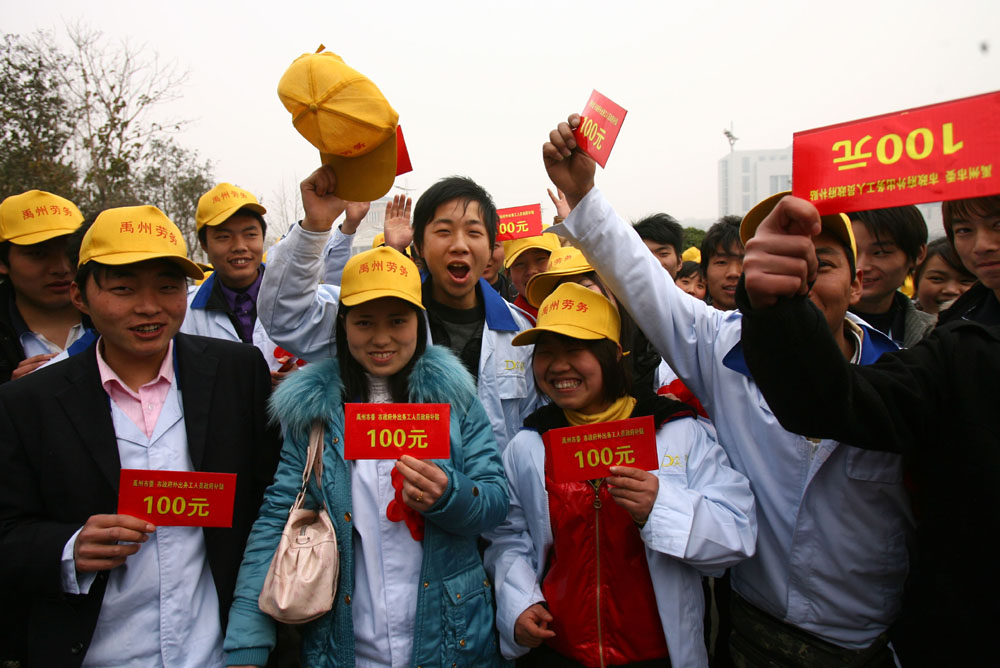 圖:已在異地找到工作的河南農民工領取100元的政府補貼(新華社)