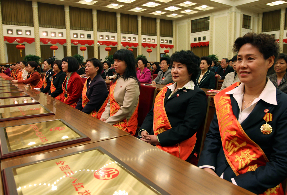 圖:7日,紀念「三八」國際勞動婦女節100周年大會在京舉行,獲獎代表在會場上(新華社)