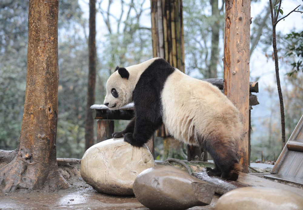 圖:海歸大熊貓「泰山」正在巡視自己的新家(新華社)