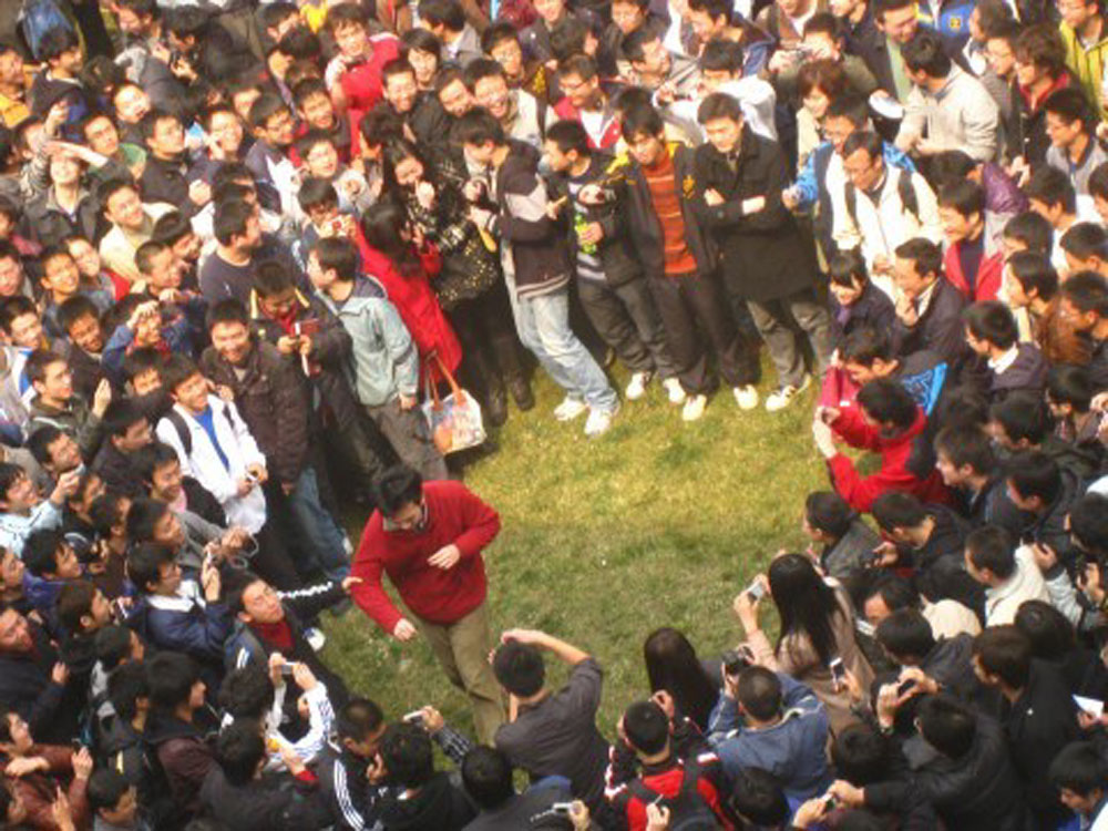 圖:成都某高校女生徵男友引來群眾圍觀。圖為應徵的「紅衣男」(圓圈示)現場表白(網絡圖片)