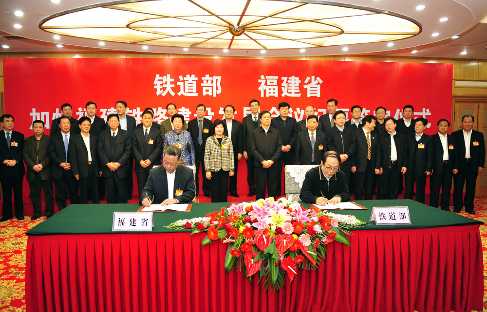 據了解,福建省政府日前與鐵道部在京簽署了一份關於加快推進海峽西岸經濟區鐵路建設發展的會議紀要。雙方一致認為,福建鐵路建設發展進入了新的歷史階段,雙方將進一步合作,加快構建「三縱六橫九環」海峽鐵路網,為海西建設提供可靠的運力支撐。