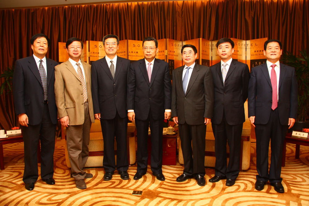 圖:中共陝西省委書記趙樂際(左四)、省長袁純清(右三)17日會見了香港媒體高層訪問團一行,並與訪問團團長、大公報總編輯賈西平(左三);訪問團顧問、國務院新聞辦六局副局長葛廣智(左二);訪問團顧問、中央駐港聯絡辦宣傳文體部副部長朱文(右二)合影,中共陝西省委常委、宣傳部長胡悅(左一)、中共陝西省委常委、省委秘書長魏民洲(右一)陪同(本報攝)