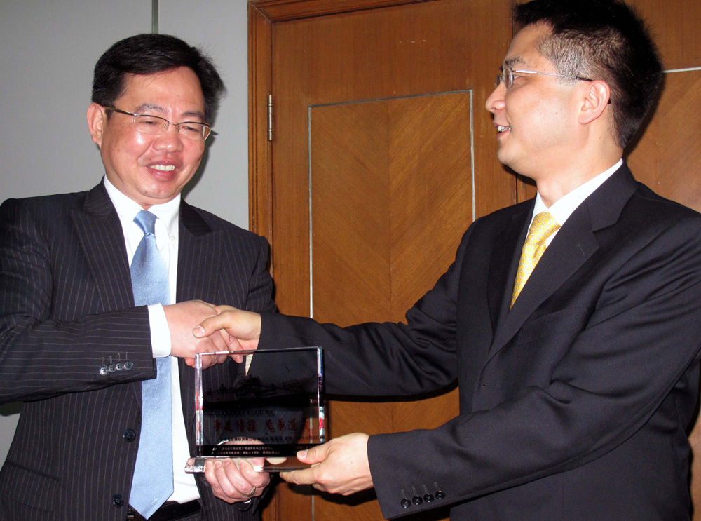 圖:台灣高雄穩發公司總經理謝龍隱(左)向中國船東協會常務副會長許貴斌致贈紀念獎座  (中新社)