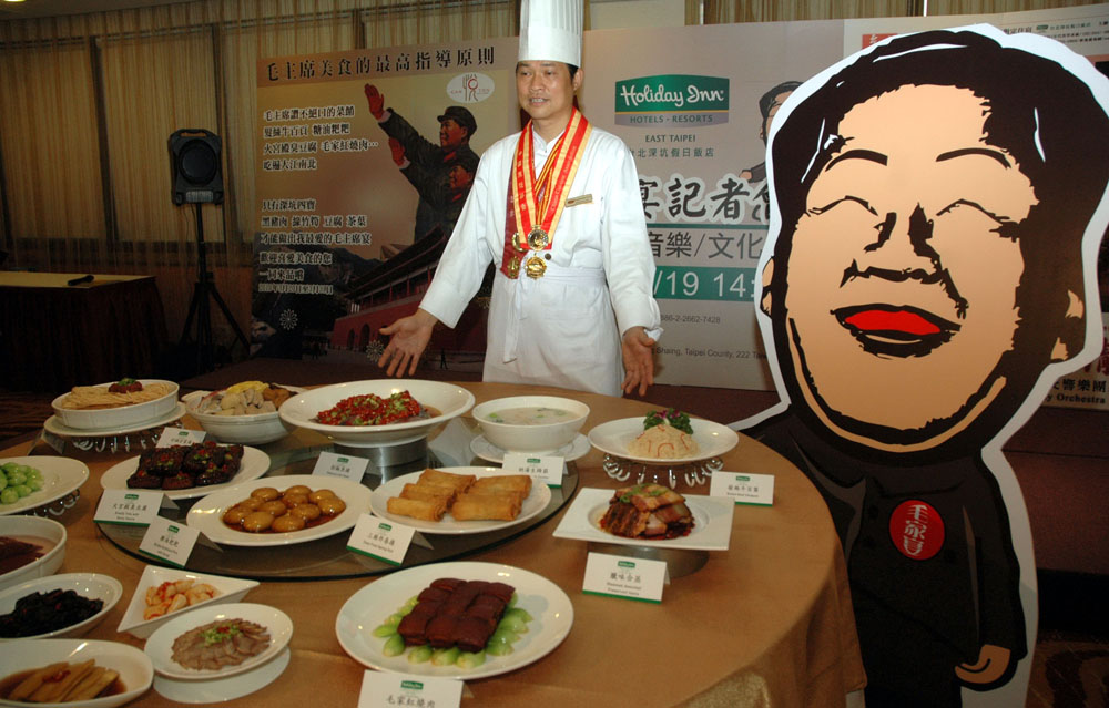 圖:兩岸交流頻繁,台北縣飯店業者結合當地食材,邀請大陸名廚張小春來台於昨日推出「毛家宴」,讓台灣人體驗已故大陸領導人毛澤東最愛的火宮殿臭豆腐、糖油粑粑、紅燒肉等。