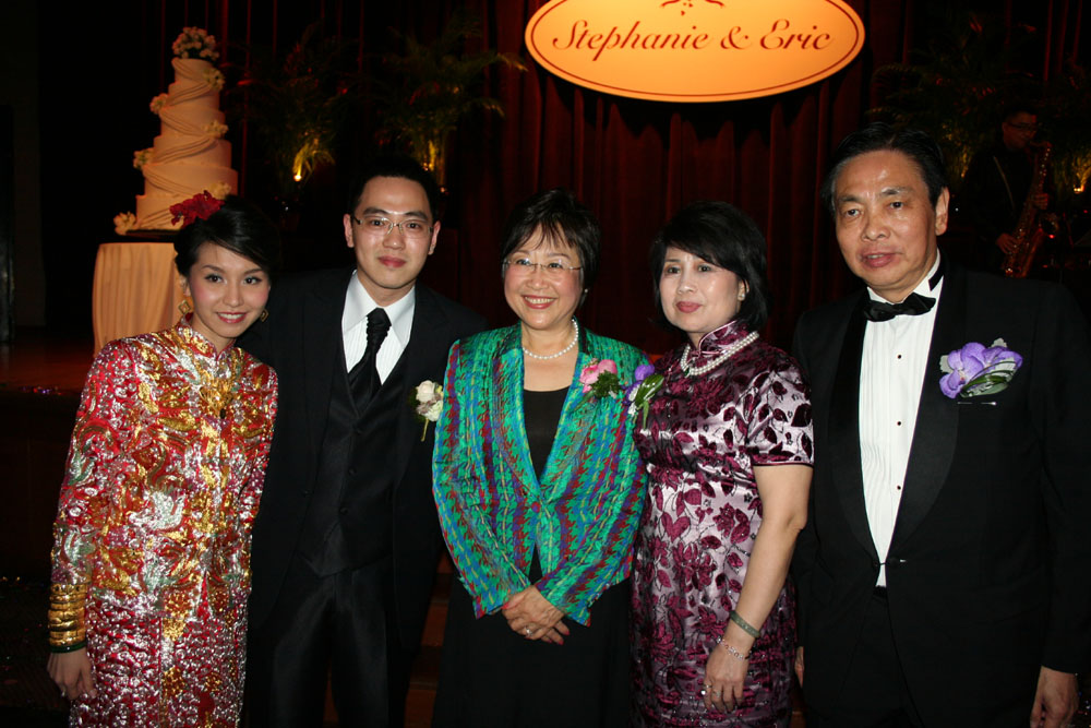 圖:立法會議員劉健儀(中)與顏乾成夫婦及一對新人合影(本報攝)