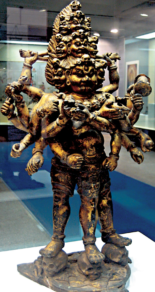 圖:銅鎏金九面明王立像。明。此尊明王立像,九面分為三層,手臂中持有各種法器