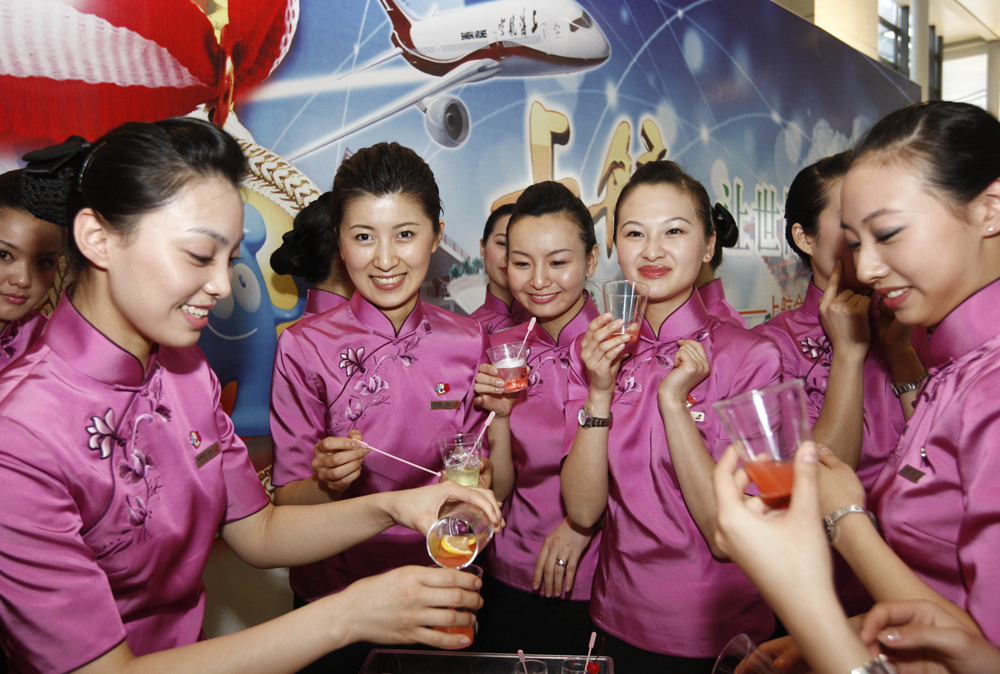 60位上海航空世博「金牌空姐」25日在上海虹橋機場二號航站樓亮相,為乘客服務。這批空姐是從上航逾千名乘務員中精心選拔出來的,將在世博航班和世博系列活動中,擔任服務示範與品牌宣傳工作,展現上海笑迎四方世博賓客的文明形象。圖為空姐們展示自製的「世博特飲」。(新華社)