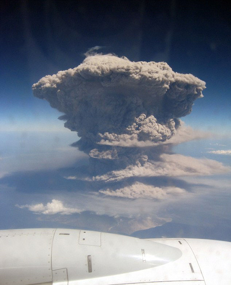 拉丁美洲蒙特塞拉特島上的蘇佛里耶火山在一次爆發時,噴出的大量煙塵與火山灰沖上了四萬呎的高空,在空中形成一朵巨大的蘑菇雲。這情景剛好被一架飛往聖盧西亞的旅遊飛機駕駛員目擊,他立刻用廣播通知機上乘客;得知消息的乘客十分興奮,用相機拍下了震撼的一幕。