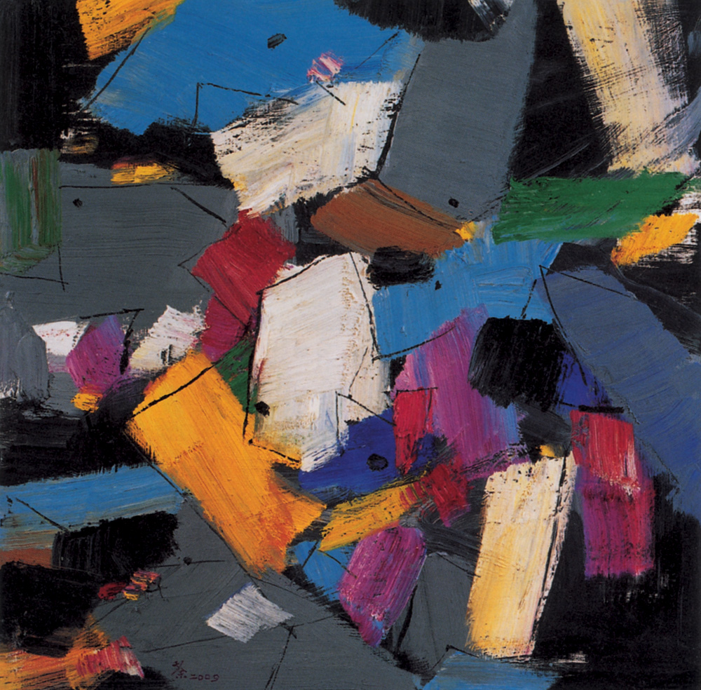 吳:這幅叫《天涯》,是油畫,我的油畫同水墨是分不清的,所以從照片上看很難看清楚是油畫。這是完全抽象的《祈年》。這個叫《飛燕》,燕子飛的動作看不見,但它是運動的。
