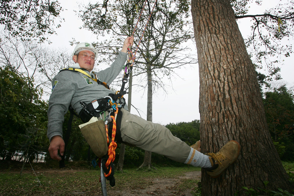 圖:Sammy這麼一張攀樹照片,事前功夫可不少,單單穿齊裝備、綁繩索已花十數分鐘時間