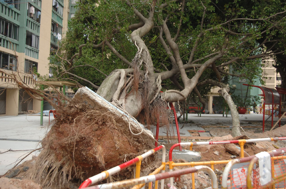 倒塌榕樹高約二十五米,樹幹直徑約一點五米,樹冠範圍逾十米寬,樹齡已有三十多年。該樹在康文署的「古樹名木冊」榜上無名。現場為愛民邨敦民樓對開休憩公園,兩個星期前,公園內進行重鋪石屎路面工程。昨日凌晨時候,榕樹突然倒下,壓毀一個涼亭,樹冠覆蓋着亭蓋。至昨日中午十二時零五分,街坊發現榕樹倒塌,擔心有人被壓傷,於是報警。消防員趕抵搜查,證實無人受傷。警員事後通知康文署鋸樹組人員到場,將塌樹清走。九龍城區議員左匯雄表示,懷疑工人翻開石屎地面掘鬆樹根,加上昨日凌晨強風吹襲致榕樹倒下。
