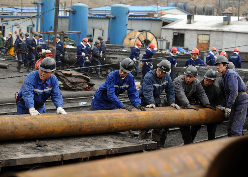圖:30日,山西礦難救援人員往井下運送排水管道(新華社)