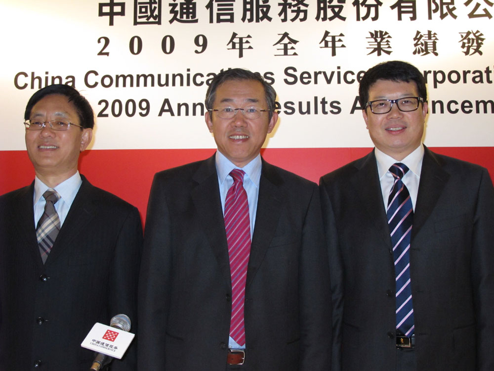 圖:左起:中國通信服務執行副總裁兼財務總監元建興、董事長李平及總裁張志勇(本報攝)