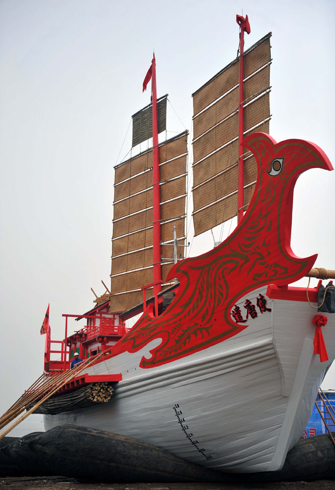 31日,日本為上海世博會重建的倣古「遣唐使船」在江蘇省張家港市正式下水。「遣唐使船」經過下水調試後,將於4月中下旬運往日本,5月份從當年遣唐使出發地大阪正式出航,重走日本遣唐使路線,於6月11日抵達上海世博會場參加「日本周」活動。(新華社)