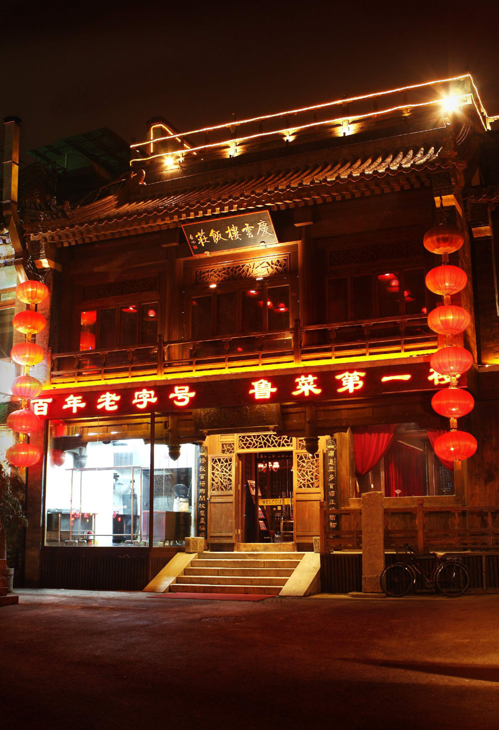 慶雲樓風格上是中國傳統木質樓房,全樓大部採用榫卯結構,由於是原址重建,所以遵循古建修復中修舊如舊的原則,全樓採用純實木結構,保持木頭的本色盡量不用清漆,並裝典歷代畫家作品真跡,突出歷史的厚重和滄桑感。重張的慶雲樓根據歷史資料復原了幾十道魯菜傳統名菜,如三不沾、葱燒海參、糟溜魚片、乾燒冬筍、南煎丸子、九轉大腸、焦溜肥腸、鍋燒鴨、芙蓉雞片、燴烏魚蛋湯、清湯燕菜、油燜大蝦、糖醋黃河大鯉魚、白扒魚肚、鍋鰨魚盒等。