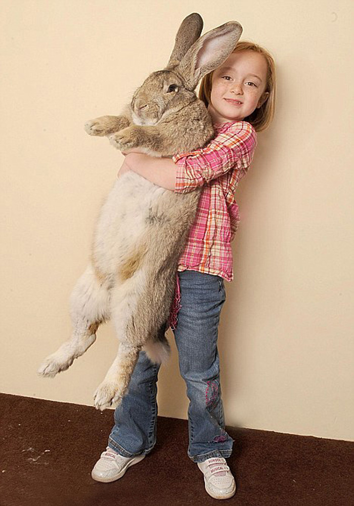 「達賴厄斯」的品種為Continental Giant,從鼻子到尾巴的長度達到4呎3吋,體重則為49磅,勢將成為女飼養員安妮特•愛德華茲的第四隻打破世界紀錄的兔子。照片可見,6歲女童喬治婭•哈德利雖然抱得起牠,但牠就像一個比她矮不了多少的弟弟一般,她的雙手一定挺累。
