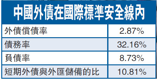 國家外匯管理局並表示,初步計算去年中國外債償債率為2.87%,債務率為32.16%,負債率為8.73%,短期外債與外匯儲備的比為10.81%,均在國際標準安全線之內。