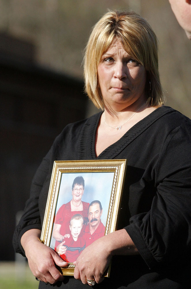圖:米歇爾·麥金妮手執父親班尼的照片等待消息。由於井下有毒氣度濃度非常高,救援工作已經暫停(法新社)