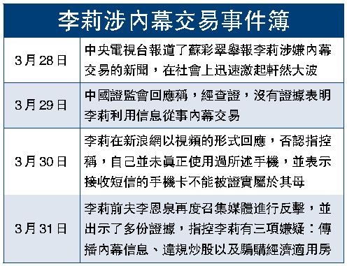 此次風波始於三月二十八日,央視報道證監會處罰委副調研員李莉涉嫌內幕交易,而實名舉報李莉的正是其前夫李恩泉及前婆婆蘇彩翠,他們共指控李莉三項嫌疑:傳播內幕信息、違規炒股以及騙購經濟適用房。