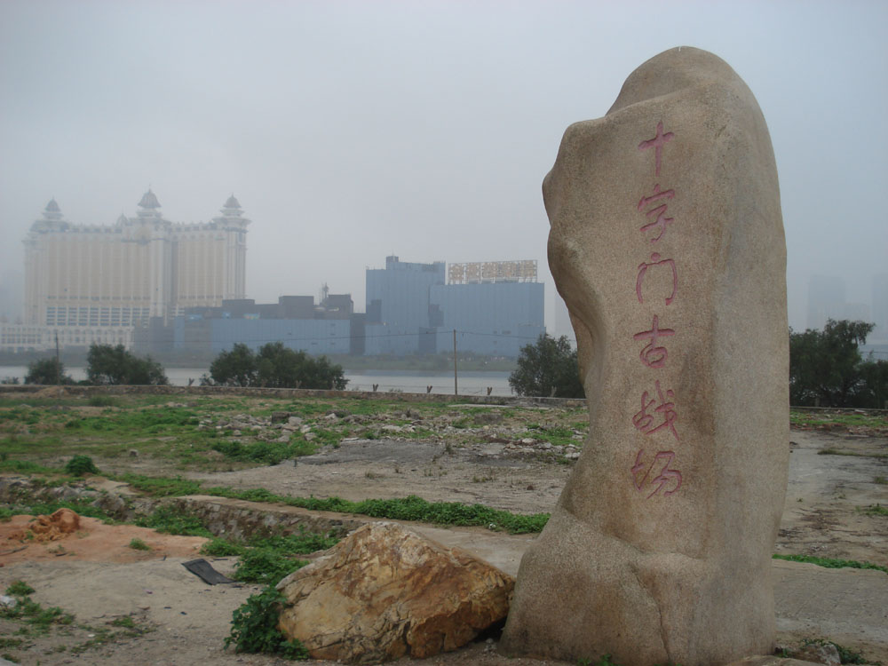 澳門氹仔島與珠海橫琴島雖為海所隔,但只是一箭之地。在與澳門氹仔島隔海相望的大片橫琴土地上舉目四望,感到荒涼,無物可觀,只有馬路邊的一塊大石映入眼簾,細看之下,但見「十字門古戰場」六個紅色簡體大字,與對岸的龐然大物威尼斯度假村形成強烈對比!這裡只是遺址,但見大片空地和指示大石,並無遺物,只有歷史痴才會前來憑弔。